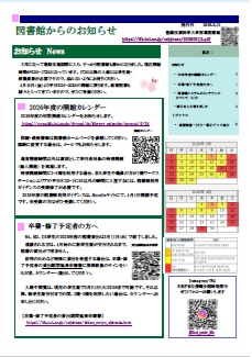 2026年3月12日号◆01 お知らせ ・ 2026年度の開館カレンダー ・ 卒業・修了予定者の方へ ・ 図書館システムのメンテナンスについて 3/19 ・ 椅子を入れ替えました ◇02 トピックス ・ 新着図書・DVD・電子ブック紹介 |